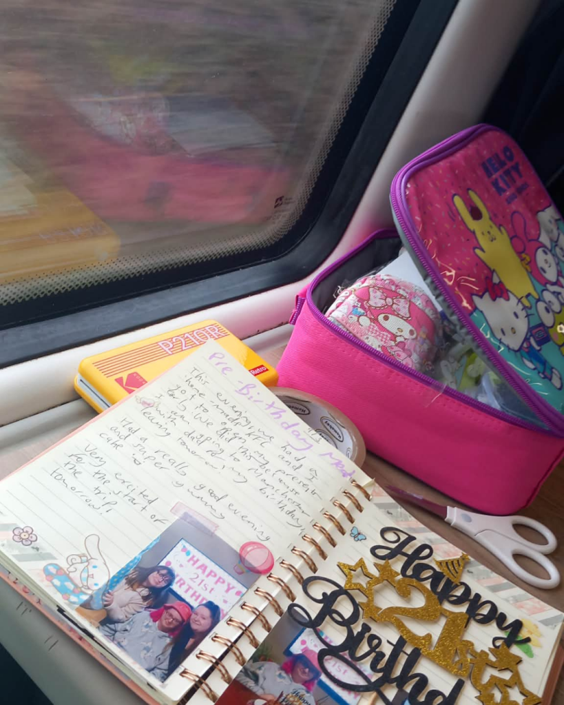 Today, we travelled from my home town all the way to Manchester. Was a very long trip but I spent most of it scrapbooking! I got a mini portable printer for my birthday (I got to open my presents early) so had a fun time using that.